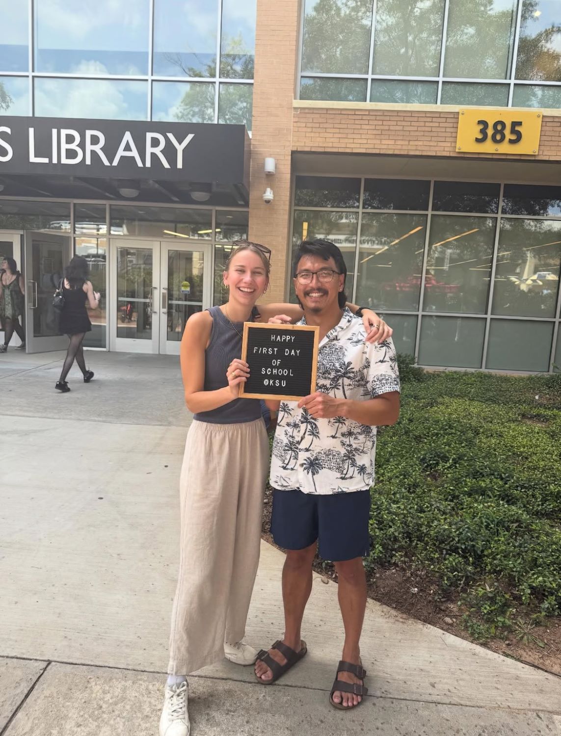 Two young adults pose in front of a school library